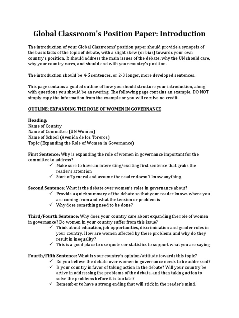 It is the preview of your piece. Crafting a thorough position paper not only allows you to gain a better understanding of your country and the intricacies of its foreign policy. Creating an outline is the first thing you should do before starting on your research paper. A position paper is an essay type that allows the writer to express his position or opinion on any topic. Then, outline the body of your essay by writing a topic sentence for each paragraph you want to include. Also, check free research paper outline template example: The use of an outline is not limited to this. In the position paper, you need to counter an idea with that one of your own. A mun position paper, also known as policy paper, is a strategic document that gives an overview of a delegates country position. Outlining is a helpful technique for writing any academic paper or any text at all. A research paper outline is created to structure the main ideas and to add them into the paper in a cohesive manner. What is the first step of research paper writing? Position paper outline guideline on writing with examples.